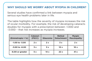 - Increased Quality of Life and ease of education. Lower degrees of myopia lead to better vision when corrected and uncorrected. Poor vision or uncorrected vision can negatively impact scholastic performance and physiological well-being. Myopic eyes are also more susceptible to severe ocular injury in the event of trauma due to a thinner sclera.