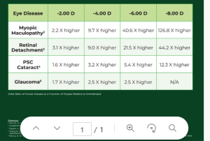Myopia (nearsightedness) occurs when the eye grows too long to be able to focus light to the back of the eye (retina). A study from the IMI (International Myopia Institute) showed that 30% of the population was myopic in 2020 but it is projected to increase to 50% by the year 2050. There are many risk factors to having myopia develop and the known studied links are listed below.